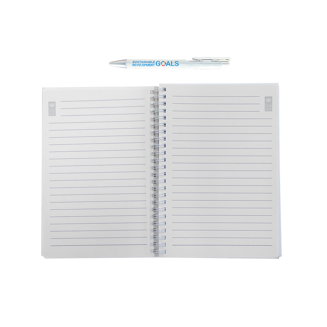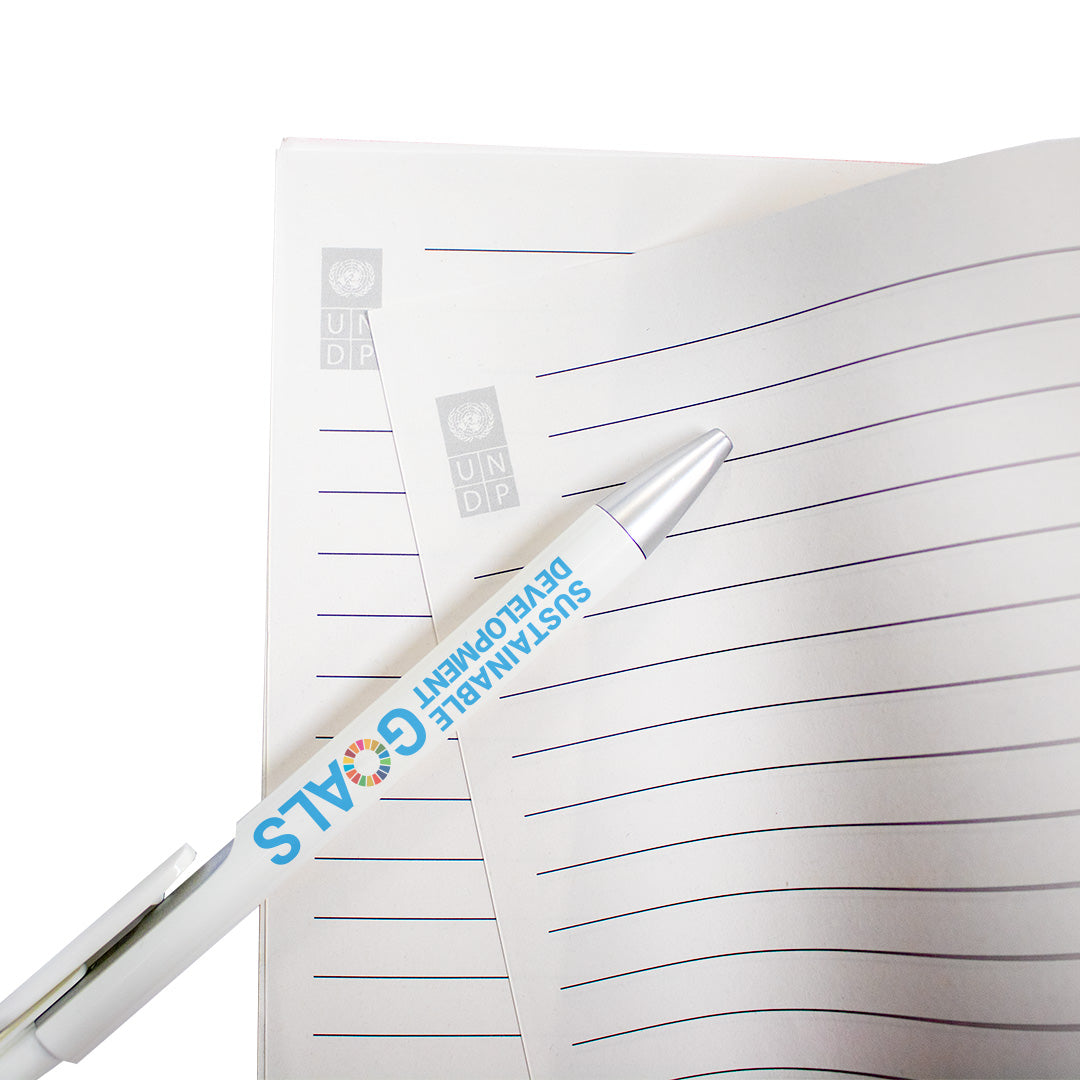From taking notes while attending the United Nations General Assembly (UNGA), to your daily class use, make everything noteworthy with our authentic UNDP SDGs pen and A5 notebook set.